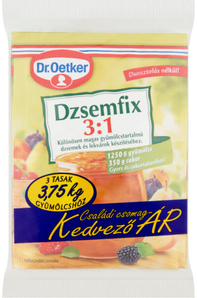 Megnevezés: Dr. Oetker dzsemfix 3:1 3 x 25 g Összetevők: Dextróz, Zselésítőanyag (pektinek (E 440)), Savanyúságot szabályozó anyag (citromsav (E 330), Tartósítószer (szorbinsav (E 200)) Allergének: Allergének az összetvők között nagybetűvel jelennek meg! Átlagos tápérték 100 g termékben: