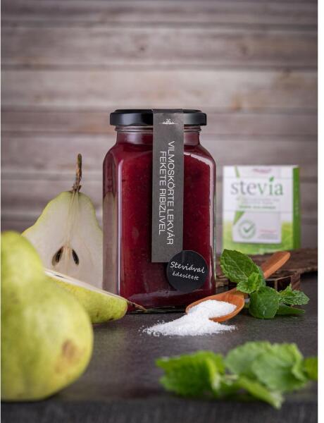 Érett illatos és szaftos vilmoskörtéből és fekete ribizliből, hozzáadott cukor nélkül  készült lekvár.